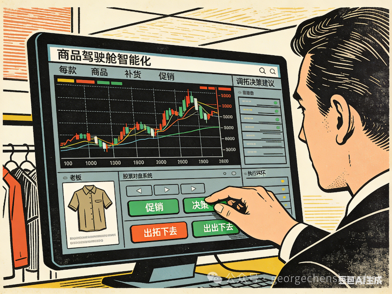 经过研究,我给老板建议是:商品驾驶舱界面应该更加智能化,可以实时生成对每款货的补货、促销、调拨等决策建议,他可以就像炒股的人盯盘一样,屏幕上显示股票的买入卖出建议,老板操作一款衣服就像炒一只股票——可以直接在数据洞察画面上,像股票下单一样来操作每款衣服的决策,然后通过自动化的工作流,将后续工作连起来,实现敏捷的、数据驱动的从洞察到执行的闭环。