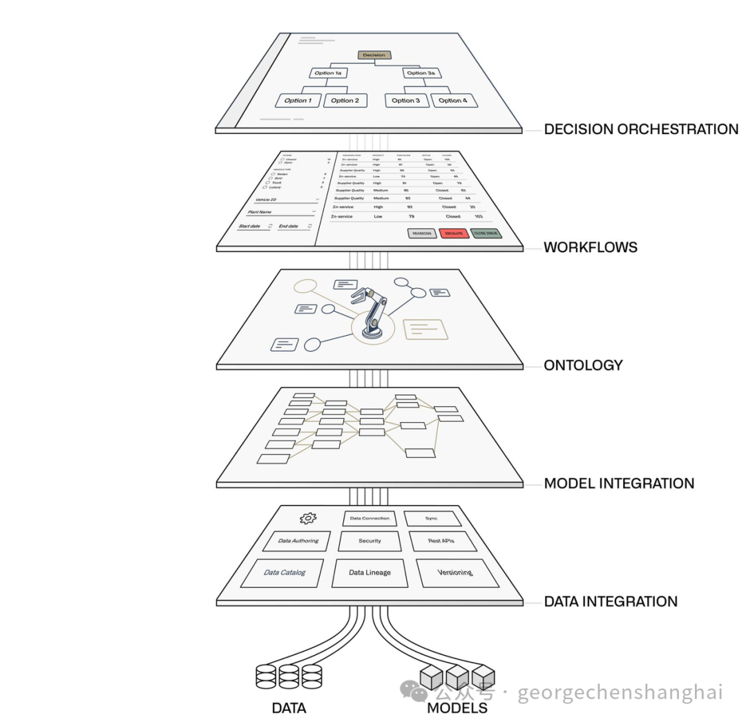 3、它利用AI/ML/优化算法,基于企业真实环境的数字孪生,计算出最优的行动方案,即决策(Decision),并将决策转化为一系列跨系统、跨部门的可执行步骤。SoA不仅是消费数据,更重要的是它能回写到底层的记录系统,完成行动闭环——这就是工作流层和决策层的编排。Palantir的“本体”是目前国内业界讨论比较热烈的话题,我个人认为它就是和知识图谱AI比较类似的语义技术,即: