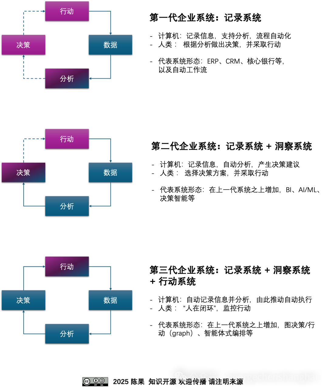 第一代企业软件是“记录系统(System of Records, SoR)”:以SAP、Oracle等为代表的ERP、CRM、WMS系统,或者核心银行、核心保险、核心物流等核心业务系统,它们负责记录企业的每一笔事务(或称“交易”)以及业务对象(例如财务、库存、客户等)的状态。第二代企业软件是“智能系统(System of Intelligence, SoI)”:以商业智能(BI)、数据仓库、数据平台为代表,也包含了一定的机器学习、人工智能、运筹优化等能力。它们负责分析数据,告诉你“发生了什么”、“为什么发生”和“将要发生什么”,用户从这些系统中获得洞察,指导业务行动。