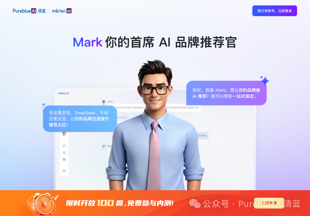此次PureblueAI清蓝同时发布了旗下AI营销数字员工平台mkter.ai,上线了行业首款AI口碑营销数字员工“Mark”。作为企业专属的“AI品牌推荐官”,Mark依托清蓝自研GEO模型算法与多智能体(Multi-Agent)架构打造,为企业提供全链路、智能化、可量化的AI口碑营销服务,助力企业快速搭建AI时代的品牌增长体系。