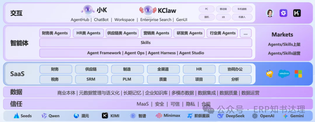 金蝶对AI超级套件的定位极具野心——不是"在SaaS里加AI",而是推动产品形态从SaaS进化为"智能体平台"。这种被称为"Live AI"的理念,强调系统具备7×24小时在线、持续学习、越用越智能的能力,通过"数据飞轮+知识飞轮"实现自我进化。传统ERP的AI应用,本质上是功能增强型的:在既有流程节点上叠加智能识别、自动填单、风险预警等单点能力,如同给燃油车加装智能驾驶模块。而金蝶描绘的AI超级套件,试图构建原生智能体架构——以"小K"作为统一交互入口,以"商业本体"作为业务知识图谱底座,覆盖财务、HR、供应链等领域的Agent矩阵,实现从"人找系统"到"系统找人"的交互范式转移。这种架构的先进性不容否认。如果向发布会所说的:当海能达通过AI套件实现计划供应协同效率提升30%,当农心科技将营销费用核销自动化率提升至90%,我们看到的不仅是效率工具,更是决策权的让渡——AI从辅助工具升级为具有业务理解能力的"数字同事"。