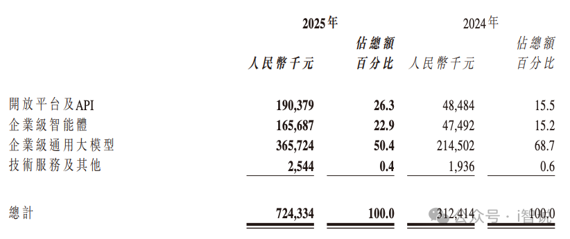 智谱收入增长主要得益于其“基座模型+平台+生态”战略的推进。按业务形态划分,开放平台及API业务收入激增292.6%至1.90亿元;企业级智能体业务收入增长248.8%至1.66亿元,成为新增长极;企业级通用大模型业务仍为收入支柱,贡献3.66亿元,占总收入50.4%。