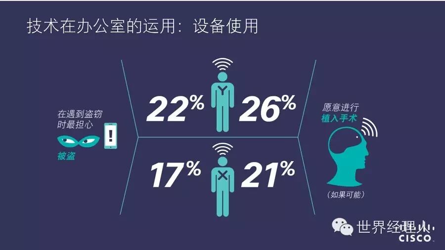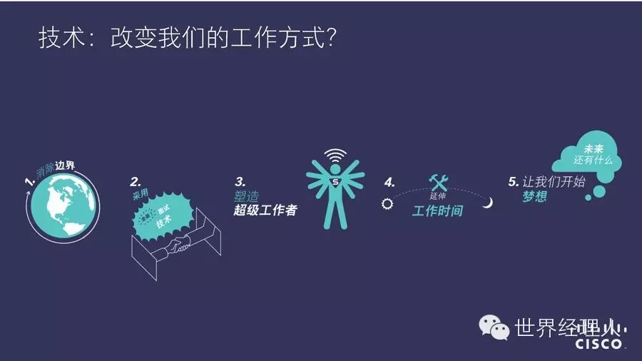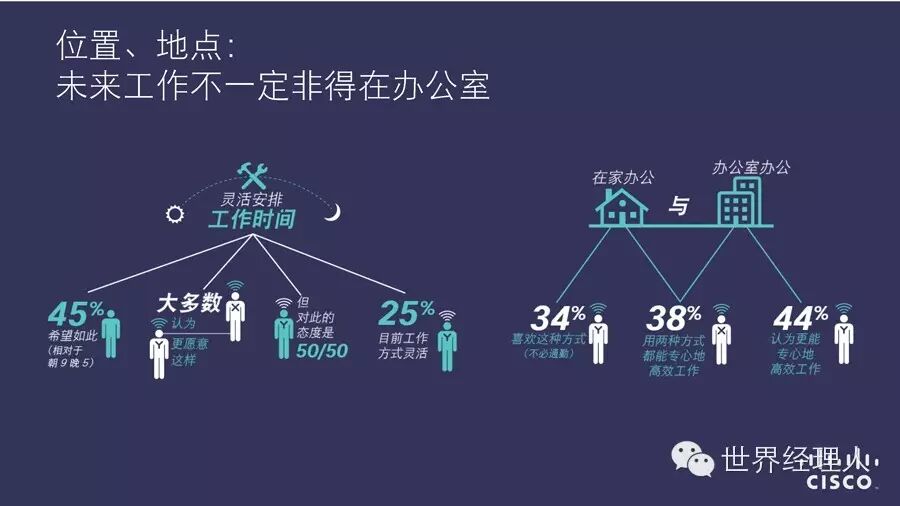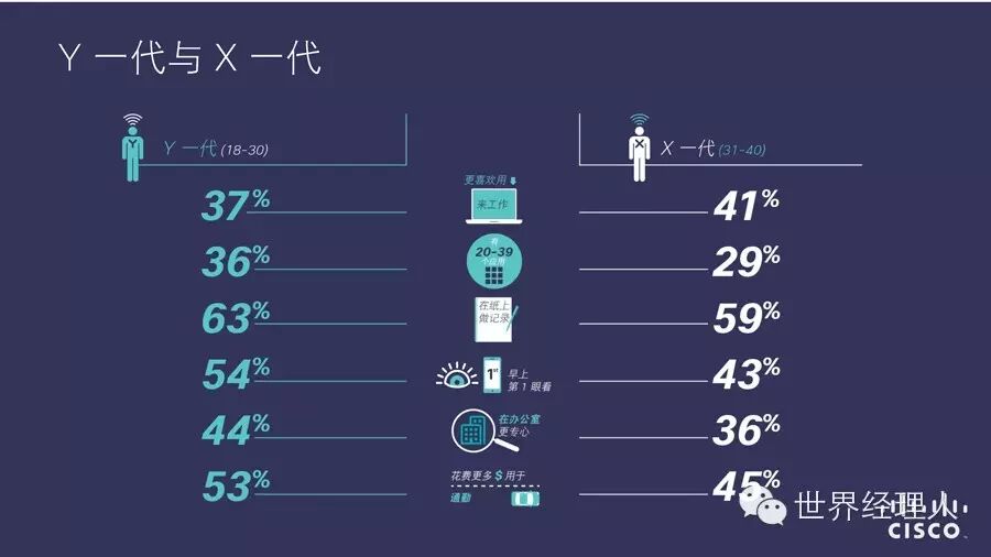 “2014思科互联世界技术报告(CCWTR)” 通过对来自15 个国家/地区的 2000 多名X一代、Y一代(Y一代指18-30岁、X一代指31-40岁)员工和从事人力资源工作的白领调研发现了“技术改变工作”的六大趋势: