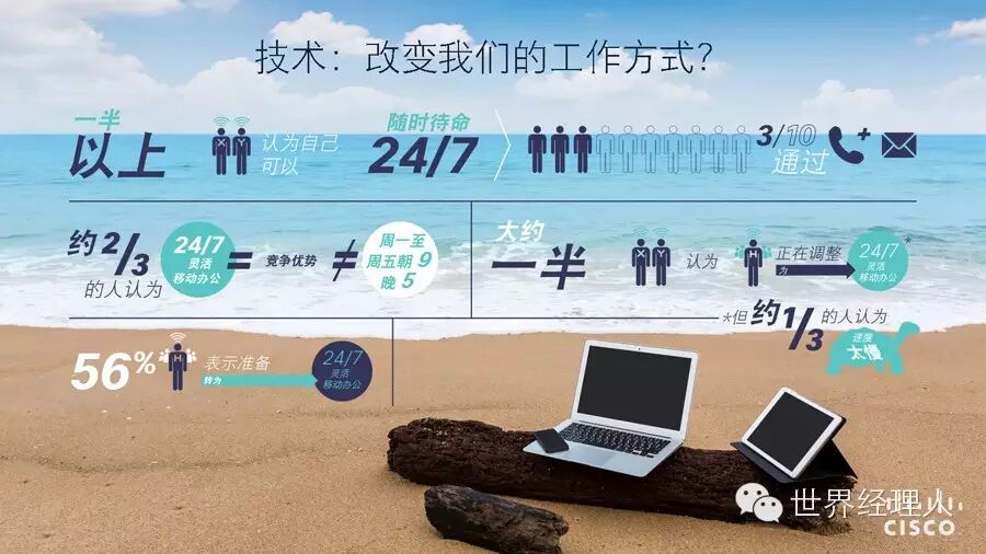 技术,给我们的工作方式带来哪些改变呢?有一半以上的人认为,通过电话和邮件,可以保证随时待命。约2/3的人认为,灵活移动办公=竞争优势,但朝九晚五的常态工作状态并不一定能带来竞争优势。受访的人力资源人士中,53%的人表示正在向移动灵活办公转型。