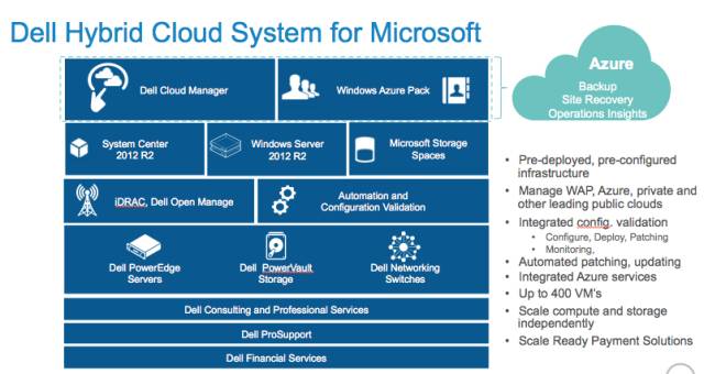 目前,DHCS for MS解决方案的软件组件包括了主要12项:Microsoft Windows Server 2012 R2、Microsoft System Center 2012 R2 、Windows Azure Pack 、Dell Cloud Manager、Dell deployment automation、Microsoft Storage Spaces、Dell OpenManage Integration for System Center 、Dell iDRAC 7 with LifeCycle Controller、Microsoft Azure Services for Backup、Site Recovery和Operational Insights,以及随着用户使用增长付费Microsoft Cloud System Platform Standard。