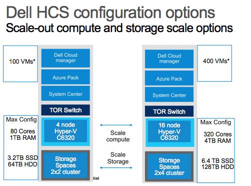 另外,硬件组件也非常明确。包括搭载英特尔至强E5-2600 V3处理器的PowerEdge C6320(最多支持16个计算节点、320个核心、400个虚拟机)、PowerEdge R730 (Storage Spaces文件服务器)、PowerVault MD1400/1420 DAS阵列(采用2x2、2x3、2x4配置,32-128TB),以及 Networking S4048交换机。
