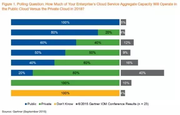 以亚马逊AWS为代表的一派宣扬的“公有云才是未来,私有云必将走向灭亡”的口号让多少人热血沸腾和记忆深刻。那么有多少用户在规划使用公有云呢?让我们来看一个有意义的Gartner调查:到2018年,你的企业有多少云上服务能力(cloud service aggregate capacity)会部署在私有云上、多少在公有云上?结果四成的人选择了八二的比例,即80%在私有云,20%在公有云。综合所有受访者来看,两者比例为64%对36%。私有云占主优势。