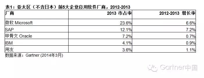 全球领先的信息技术研究和顾问公司Gartner最新全球软件市场占有率统计报告表明,2013年亚太区(不含日本)企业应用软件市场增长6.5%,达到126亿美元,较2012年有微幅增长。全球领先的信息技术研究和顾问公司Gartner最新全球软件市场占有率统计报告表明,2013年亚太区(不含日本)企业应用软件市场增长6.5%,达到126亿美元,较2012年有微幅增长。 应用软件市场主要包括:企业资源规划软件(ERP)、办公套件、客户关系管理软件(CRM)、商务智能软件(BI)、供应链管理软件(SCM)、企业内容管理