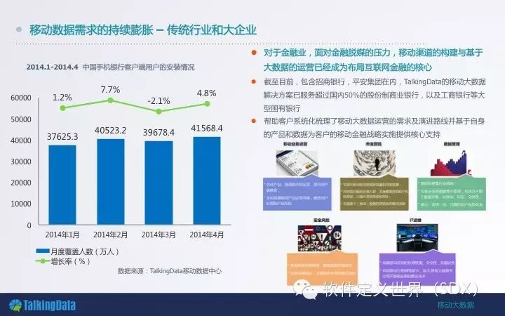 对于金融业,面对金融脱媒的压力,移动渠道的构建与基于大数据的运营已经成为布局互联网金融的核心。目前,包含招商银行、平安集团在内,TalkingData的移动大数据解决方案已服务超过国内50%的股份制商业银行,以及工商银行等大型国有银行。帮助客户系统化梳理了移动大数据运营的需求及演进路线并基于自身的产品和数据为客户的移动金融战略实施提供核心支持。