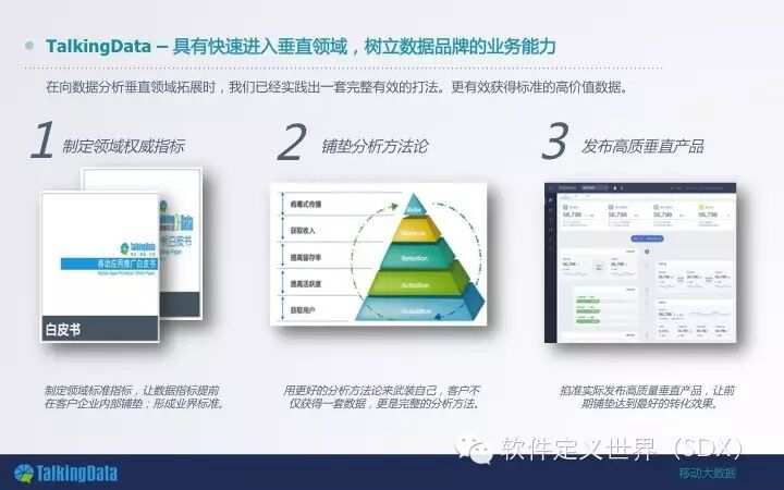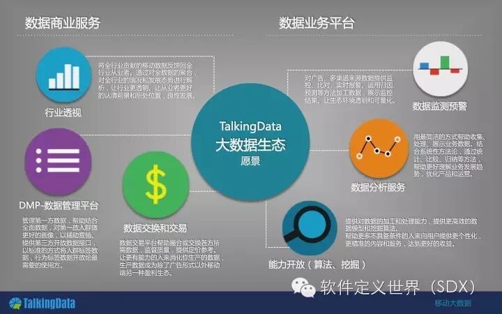 但从公司的定位和愿景来看,我们是完全不同的公司。首先TalkingData定位于中立的第三方数据服务平台,提供专业的数据服务,我们并不涉及上层业务,比如:渠道分发、广告投放、游戏发行、风控模型等。第二,我们更专注于如何利用数据产生价值,以及如何利用数据增值,而不是提供数据工具本身。所以我们创业第二年就推出了很多垂直行业的数据产品,比如游戏、电商、金融等数据统计分析产品。我们认为只有和具体业务场景结合的数据才是比较有价值的。