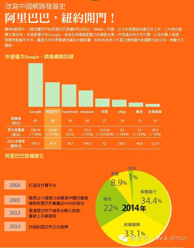 对电子商务、对中国,这都是一个相当激励人心的故事。中国最大电子商务公司阿里巴巴集团9月19日以“BABA”代码,正式在美国纽约证交所上市,上市首日股价大涨38%,创办人马云不但以250亿美元身家荣登中国首富,市值更仅次于Google。经此一役,阿里巴巴也不再只是独霸中国一方的公司,而是和Google、Facebook、Amazon相提并论,被视为全球极具影响力的网络企业。
