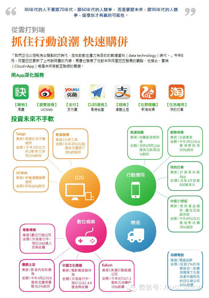 分析阿里巴巴的移动策略,大致可分为两大方向:一是O2O应用,另一个就是基础的云端计算。在O2O部分,阿里巴巴集团O2O事业部总经理吴倩今年2月在一场演讲中指出,过去在线与线下是两条并行线,要将这两条线接起来,靠的是两个途径:一是社交网络,另一个就是地图,因此每一个跟O2O核心价值相关的产业,都会成为一个非常重要的投资热点。在社交方面,阿里巴巴收购了新浪微博和陌陌;地理位置部分,则是收购高德地图。