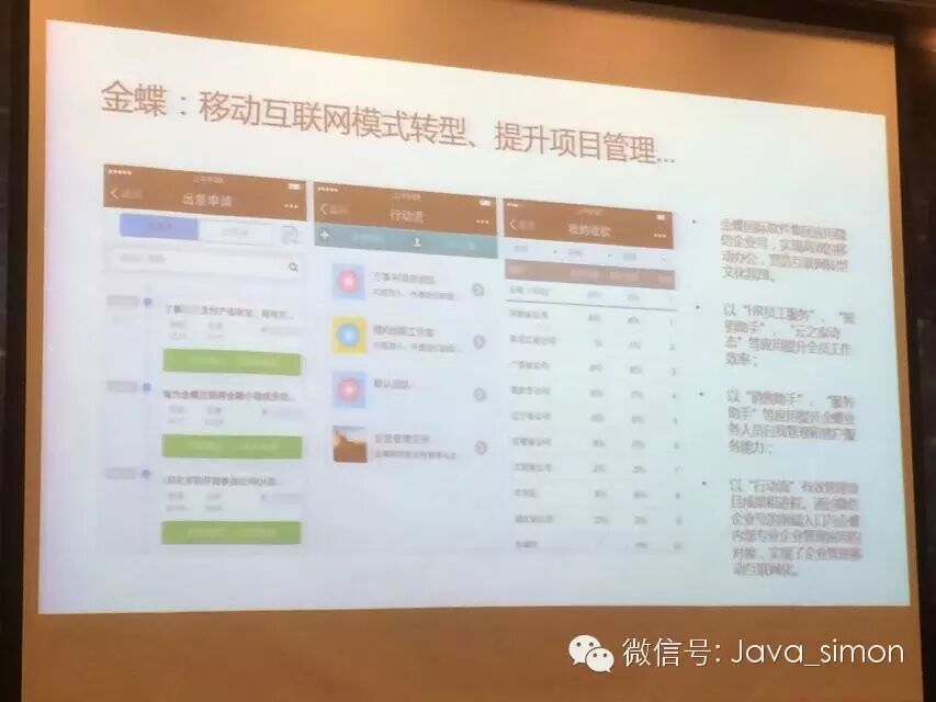 金蝶,金蝶自己也是一个做企业应用的公司,它有OA、ERP等一系列的产品,但是它自己内部也同样需要有一个内部管理的系统,同时它的云之家也和微信企业号对接,比如有员工出差还有销售,金蝶收款比较慢,不会一下子销售完了就能收到款,可能有账期的问题,原来查起来很难,现在通过微信公众号查起来就比较容易了。