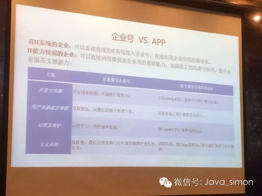 APP跟这种企业号的对应会有一点不一样,开发实施,微信企业号这种开发成本会比较低一点,APP相对来说会比较难一些,然后活跃度上,微信的活跃度很高。比如腾讯,腾讯有自己的办公APP,但是我也设了它提醒,它提醒的时候我没有看到,就会错过一些审批流程。我进入微信里面会看,看到有消息会马上处理,这种其实活跃度完全不一样的。运营维护上,APP你要开发很多版本,比如说Android的或者ios或者其他的版本,在运维和开发的过程中,企业的工作量是很大的,包括每次升级都要跟着版本来升级。而微信企业号则没有这些麻烦。