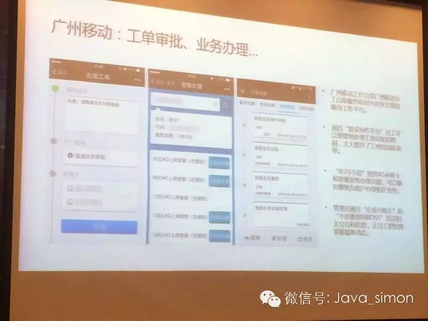 广州移动,广州移动里面有一个很好的应用,我们以前在办移动的卡的时候是需要到营业厅办的,但是现在不用,可以到每个营业网点甚至路边摊都可以办,为什么说可以办?就是把它的4G写卡易放到手机号里面了,比如有些摆摊的人可以登录到自己的权限里面把信息写入4G卡,同时有一个小盒子,把卡插入里面升级到4G,我们就不用说跑到很多营业点办,甚至很多上门的服务人员也可以上门通过微信企业号帮你填写这些信息。