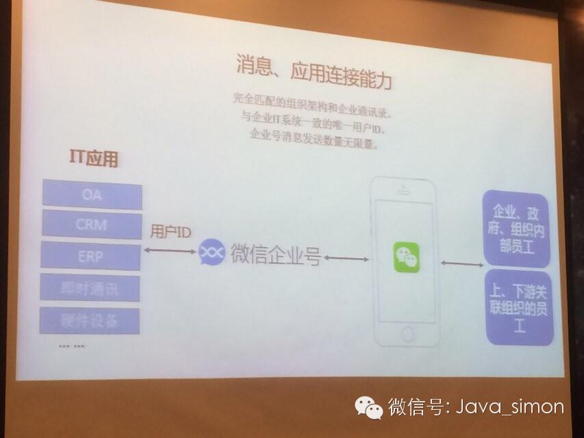 第二个我们有唯一的用户ID,每个企业应用都有一个用户ID,很多企业里面用户ID都是互通的,企业里面也是用唯一的用户ID,你通过内部系统发送信息或者传递工作流都是根据内部系统流程一样,说白了,企业号把原来看到的界面放到微信上,企业应用的组织架构都是完全一样的,刚才提到企业号发送消息是无限的。