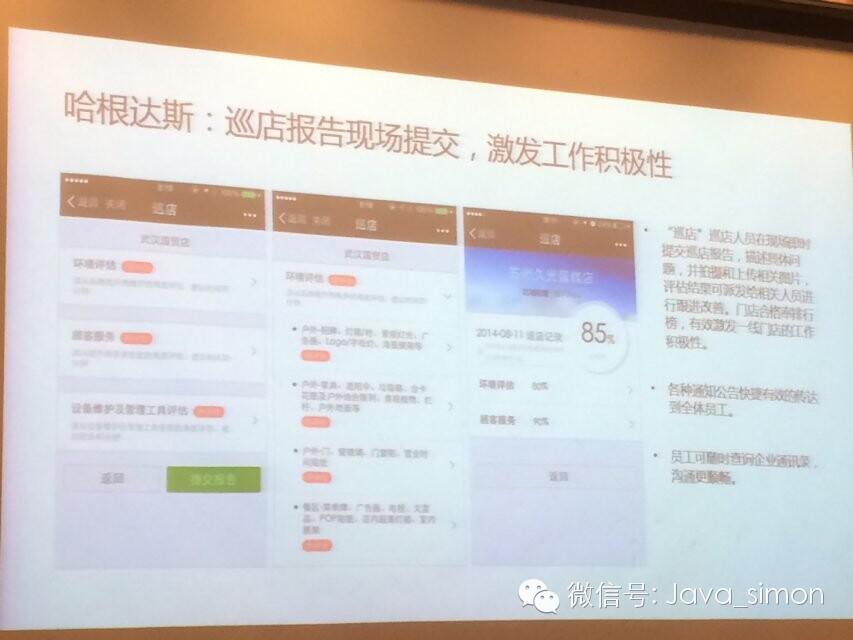 哈根达斯,这里面很强的是有一个巡店的功能,比如连锁餐饮或者连锁的专卖店或者品牌公司需要在很多商场里面布货,其实都需要巡店,哈根达斯做了一个巡店计划,包括评分,通过这个来激发每个店的营销的能力或者管理的能力,因为人都这样,看到这个排名或者积分之后,如果分数很低就会很不开心,然后努力干,这其实是用了移动互联网人争先恐后的方式在做这个产品。