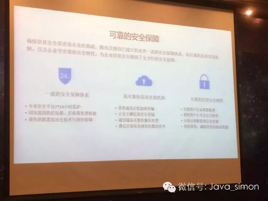 最后就是每个企业应该会比较注重企业号到底能做哪些事?信息是否安全,我企业的信息在你那里跑,都是我内部非常关键的东西,腾迅表示微信它本身是在腾讯的架构下面,腾讯本身建立了这么多年的QQ到现在的微信,包括整个平台、服务器的安全方面都是做的很好,我们从2005年建立安全的团队,现在有大概2000多个专门负责产品信息的安全,所以在这个方面没有问题,并且微信也专门成立了一个团队,针对微信的信息安全,微信信息实在量太大了,并不是说每天都会保存你们在微信上聊天的信息,大概3天的时间就会删除掉。