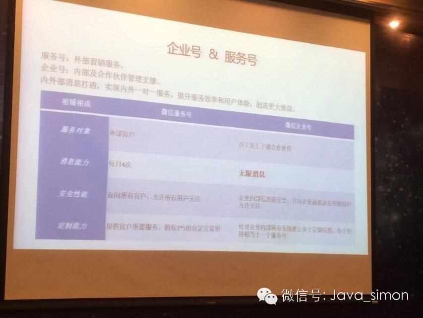 在服务对象上,服务号是对外的,对你的客户,就是一线的客户,那么企业号主要对企业内部的员工或者你上下游的合作伙伴,包括供应商或者代理商、经销商。在消息能力上,每个服务号的消息能力是每月4次,企业号是无限次,因为都是你的员工,甚至从你这里拿钱,如果是供应商或者经销商,都通过你盈利,他不介意你的消息数量是多少。