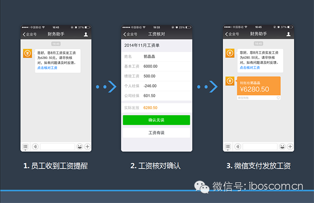 马云希望让中国企业能够用支付宝发放工资的构想,也许在未来可以在微信支付上得以实现。对于大型企业,每月向员工发放工资是一项相对庞大而繁琐的工作。基于微信企业号,员工可以在财务助手中收到工资条,并直接完成工资单的核对,避免了与财务人员面对面的签收。倘若微信支付能够在企业号进行开放,将可以实现员工在微信确认工资单后立即通过微信支付发放工资。马云多年的夙愿或许将被微信支付来完成。工资被打入微信账号后,微店消费、微信支付便成了水到渠成的事,