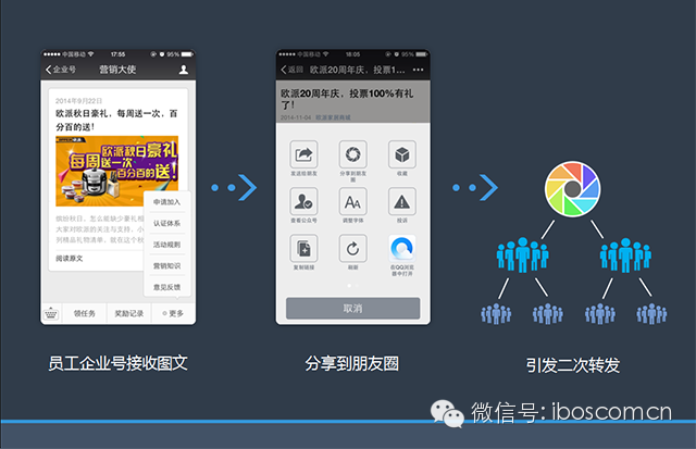 基于微信企业号,企业可以通过营销大使模块鼓励员工参与分享传播企业产品、服务、活动信息,让每个员工都成为公司“水军”的一员。企业可以根据员工的职位以及好友数量来界定“水军”级别,不同的级别将决定了员工分享后所能获得的回报。公司员工、上下游有10万人,而每个人平均有两百个好友,那么当这10万人分别转发公司的产品、服务、活动信息,所产生的营销价值将会比一个具有2000万粉丝的公众号推送营销信息带来的还要大。