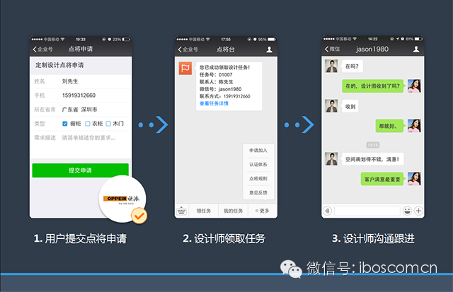 在微信大战略中,如果狭隘地认为企业号仅仅是解决企业内部沟通问题则将会大大地减低企业号的价值。当企业号与服务号、订阅号连接起来,就会延伸出许多新的玩法。譬如某以定制类产品为主导的家居企业,以往用户只能通过实体店进行需求提交,而现在通过微信服务号能够直接提交设计申请,并且系统将根据地理位置以及需求属性推荐到合适的设计师当中,设计师通过企业号领取设计任务,并可以直接添加客户微信进行一对一的沟通。设计完成后用户对设计师评分,公司根据用户对设计师评分进行绩效考核。