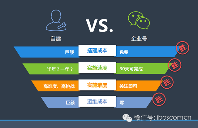 大家会发现,如果上述的价值需要通过自建系统成为现实,企业将会面临搭建成本高、实施周期长、实施难度大以及运维成本庞大等问题。但基于微信企业号,企业将能够轻松地避免上述问题。