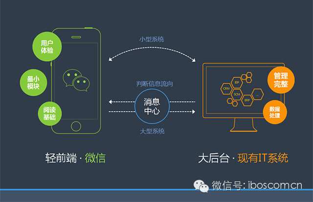 对于小型系统,可以在微信企业号应用与企业现有IT系统直接建立连接;对于大型复杂的系统,建议在中间建立一个消息中间件,通过消息中间件可以判断信息的流向,消息队列、异步推送缓解服务器压力。