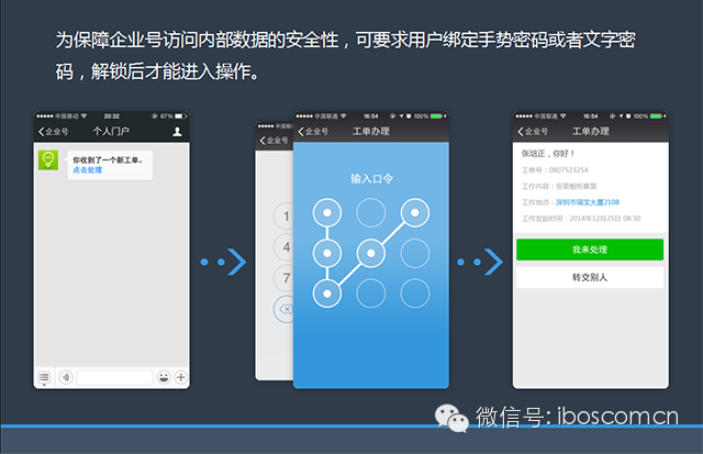 目前,无论是微信账号的登录机制、企业号后台登录机制还是微信与系统对接的机制都是十分安全的。然而,这一说法需要建立在两个假设下:1、对微信充分信任;2.用户手机已设置密码且不丢失。对涉及核心数据的模块,我们在通过微信链接进入系统的过程中增加一个密码验证层。