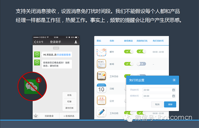 我们不能假设每个人都和在座的CTO一样都是工作狂,热爱工作。事实上,频繁的提醒会让用户产生厌恶感。因此,可以考虑给员工自行设置在线状态,我们在设计系统的时候也应该增加允许设置消息免打扰时间段。