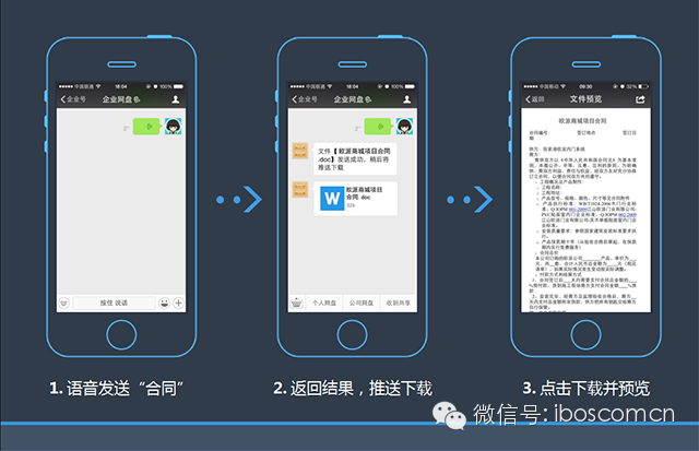 我们假设一个外出员工需要查找公司网盘上的文件,这时他只需打开微信企业号发送文件名或者直接发送语音,系统通过中间件将语音转换为文字并通过后端查找到相应的文件进行推送,员工立即获得文件。